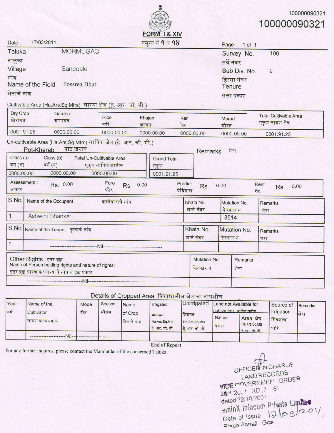 SURVEY NO 199/2, OF VILLAGE SANCOALE, , MORMUGAO, GOA , South Goa