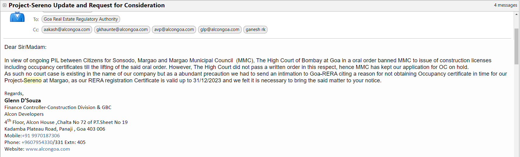| Occupancy Certificate from Margao Municipal Council | 3(OC)1/24-25/TECH/03 | 10-Apr-2024 | 17-Apr-2024 |