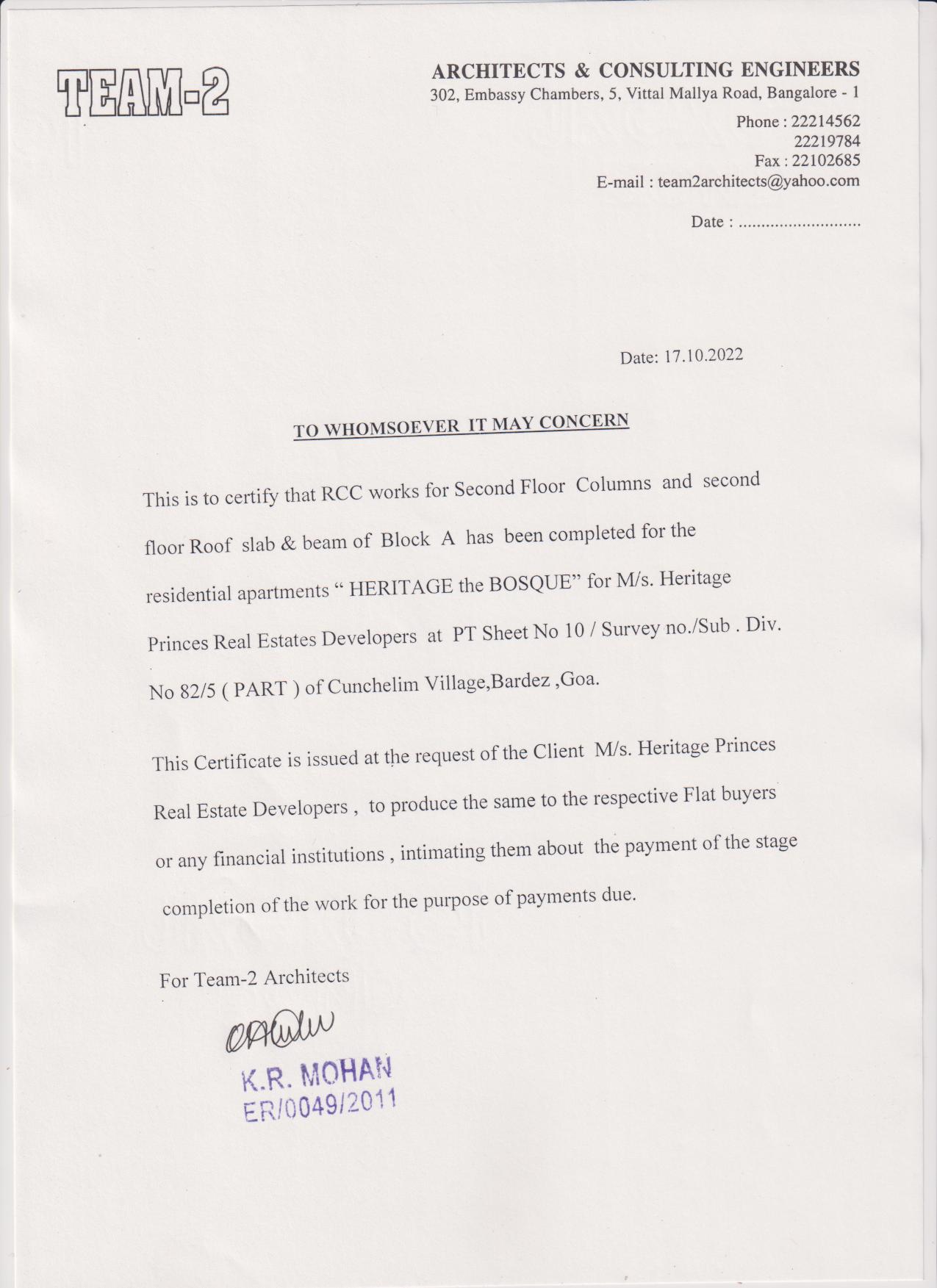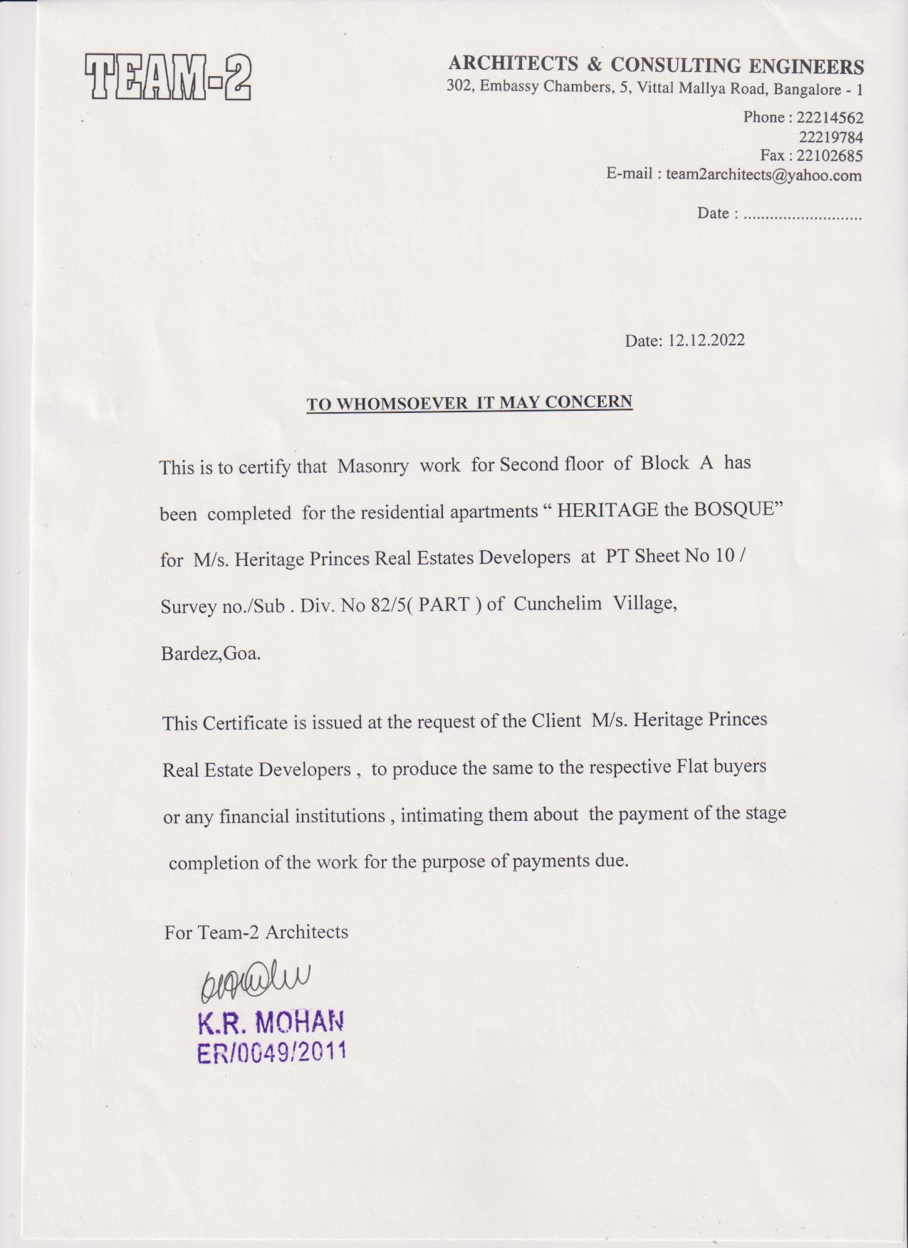 | Other documents/information | Fifth Stage architect certificate for A block | 5th Stage Completion Certificate - Block A.pdf |