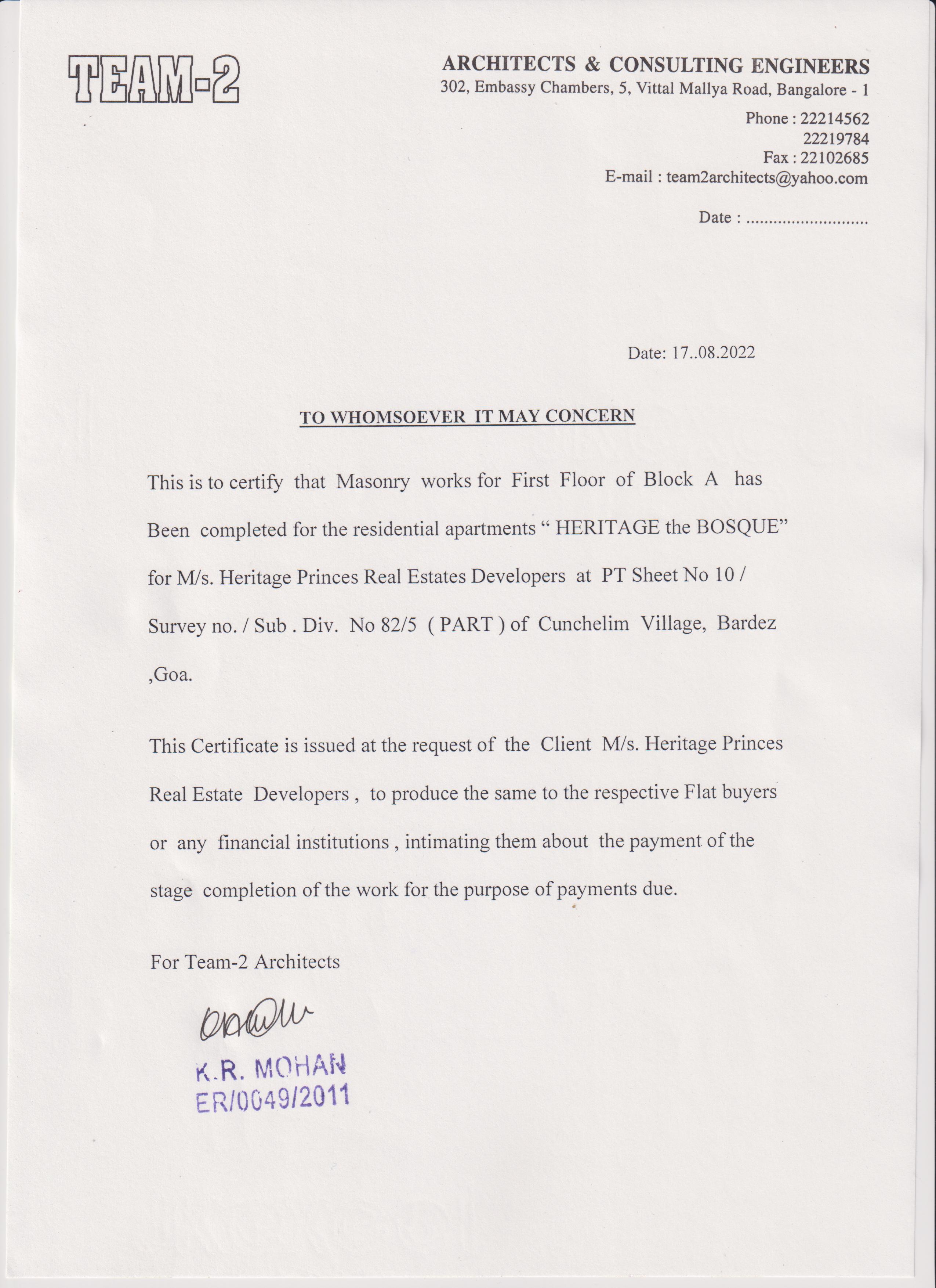 | Other documents/information | First floor masonary Block A | Architect Certificate of 1st Floor Masonary work.JPG |
