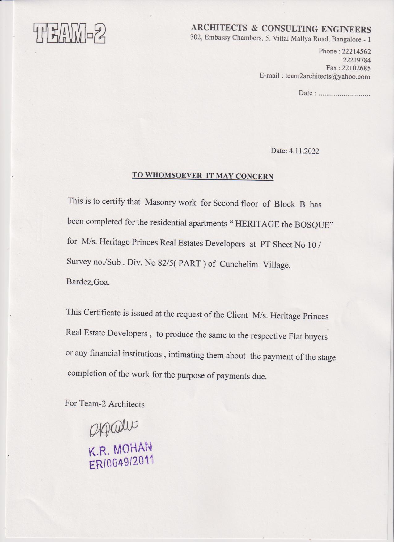 | Other documents/information | Fifth Stage architect certificate for B block | 5th Stage Completion Certificate - Block B.pdf |
