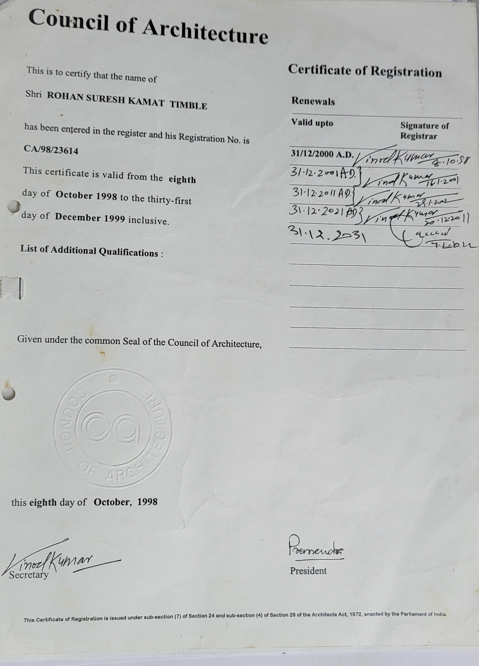 | Other documents/information | New Architect Council of Architecture Regn | New Architect Arch Rohan S K Timble Council of Architecture Registration.jpg |